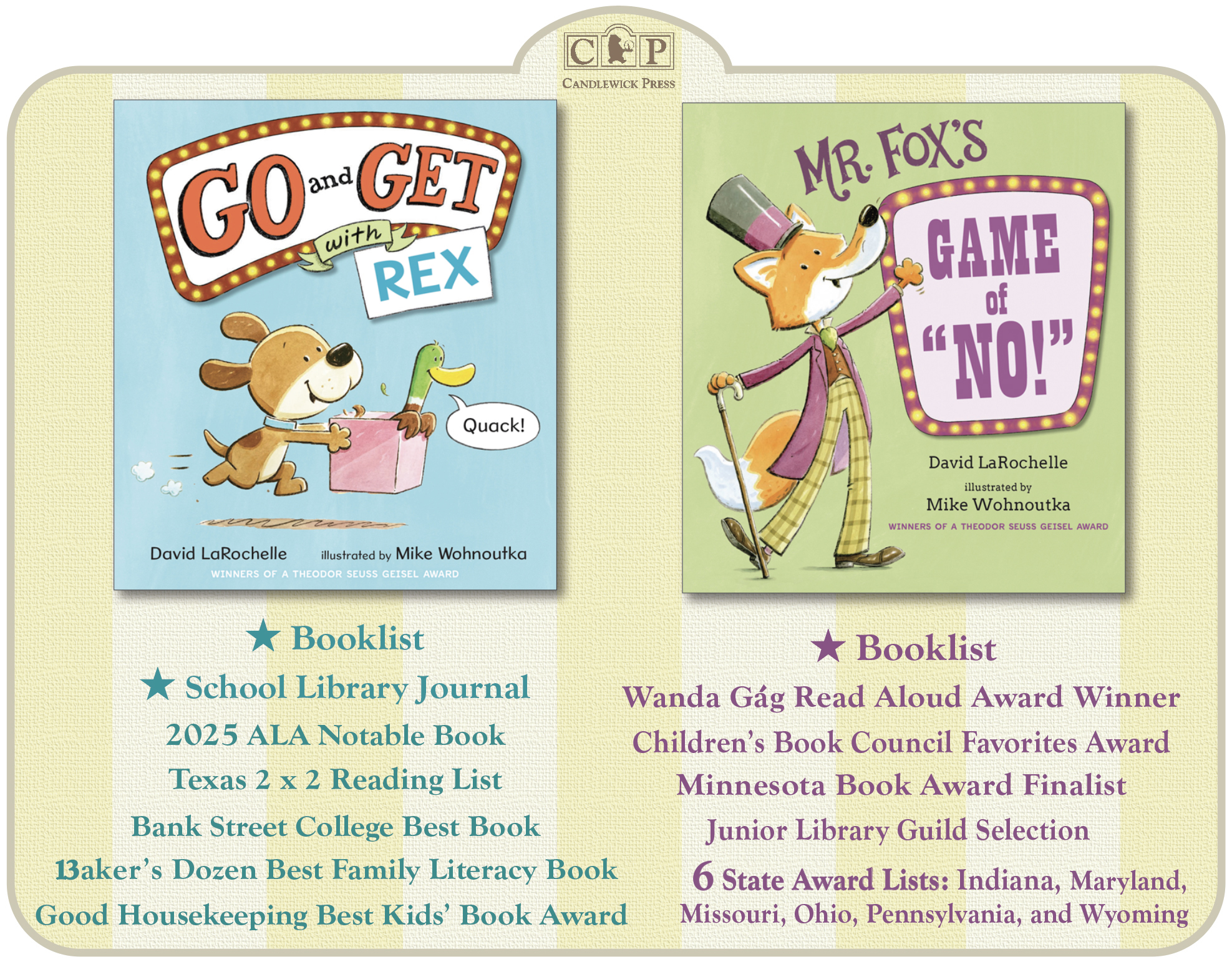 Go and Get with Rex and Mr. Fox’s Game of “No!” both published by Candlewick Press in 2024 and written by my good friend David LaRochelle. We are so happy with all the nice accolades these two picture books continue to receive! The latest good news is Mr. Fox won the 2025 Ohio Buckeye Award for Grades K-2, and Go and Get with Rex is a finalist for the Georgia Children’s Picturebook Award and the South Carolina Picture Book Award!